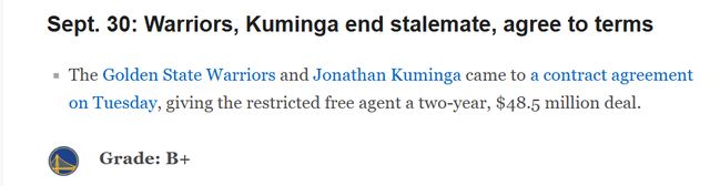 北京时间10月1日,勇士和库明加达成一份2年4850万美元的签约协议,第二年是球队选项。随后ESPN对这笔签约进行评级,给出了B+。以下是具体解析——